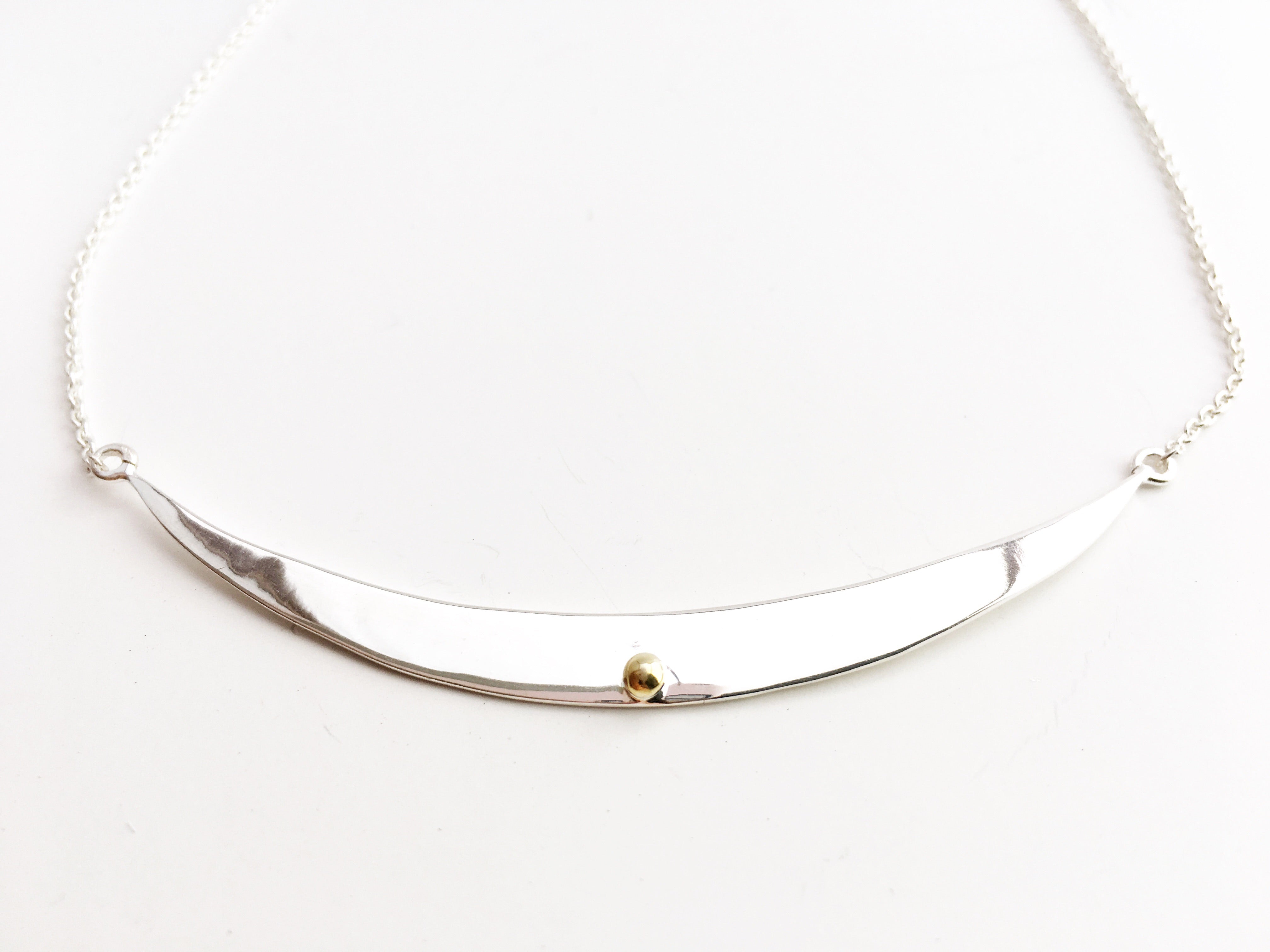 From our Shield Maiden Collection, a Crescent pendant necklace in sterling silver, with an 18k gold bead placed at center of pendant. Designed to highlight any neckline as a solo piece, but don’t be afraid to layer this beauty with other chains. Inspired as a piece of protection, a shield in design.