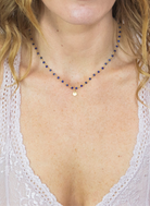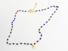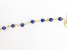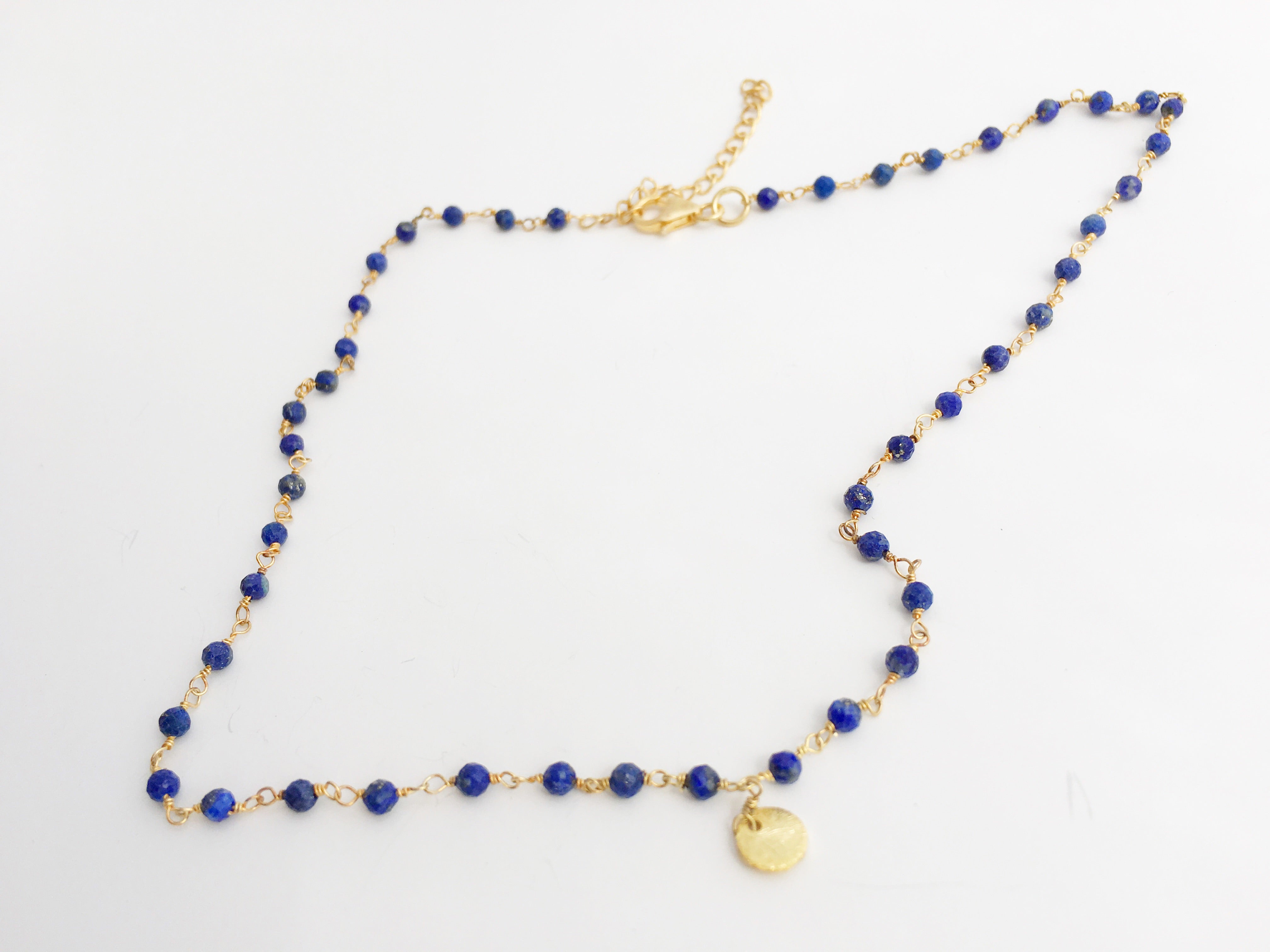 Lapis lazuli gemstone beaded rosary chain with a Brushed Gold Vermeil Disc pendant at center (Disc 6mm round) —- 15 inches PLUS 2 inches extension.