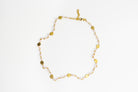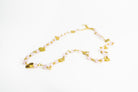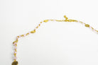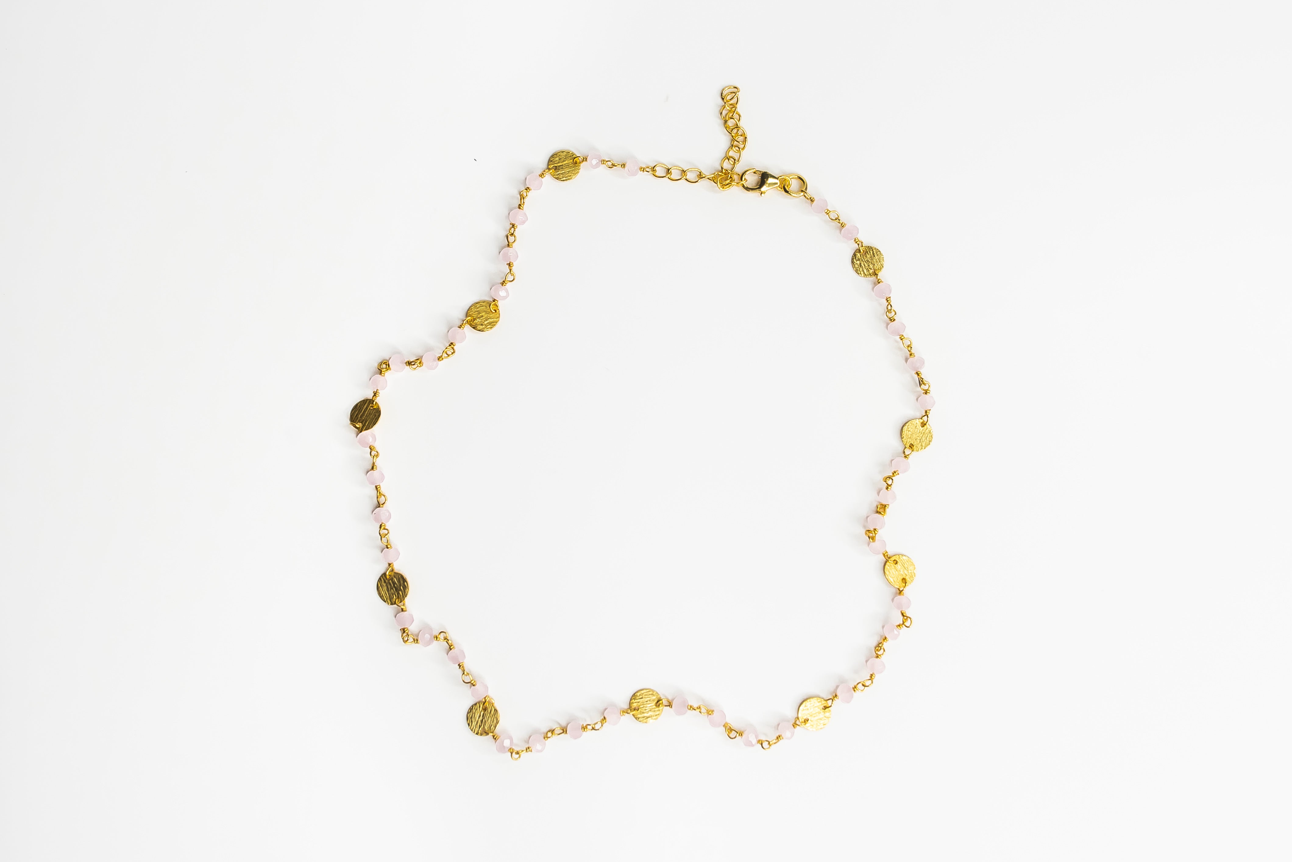 Pink Chalcedony Infinity Necklace, featuring 3-4 mm gemstones set with small brush coin detail.