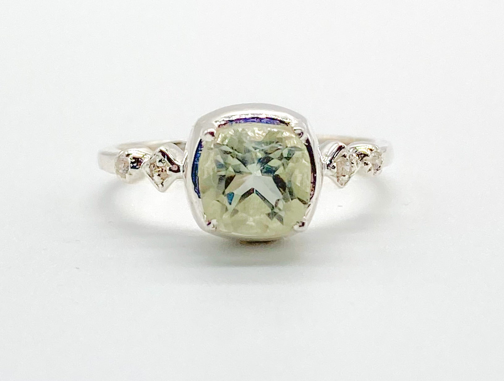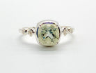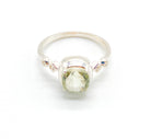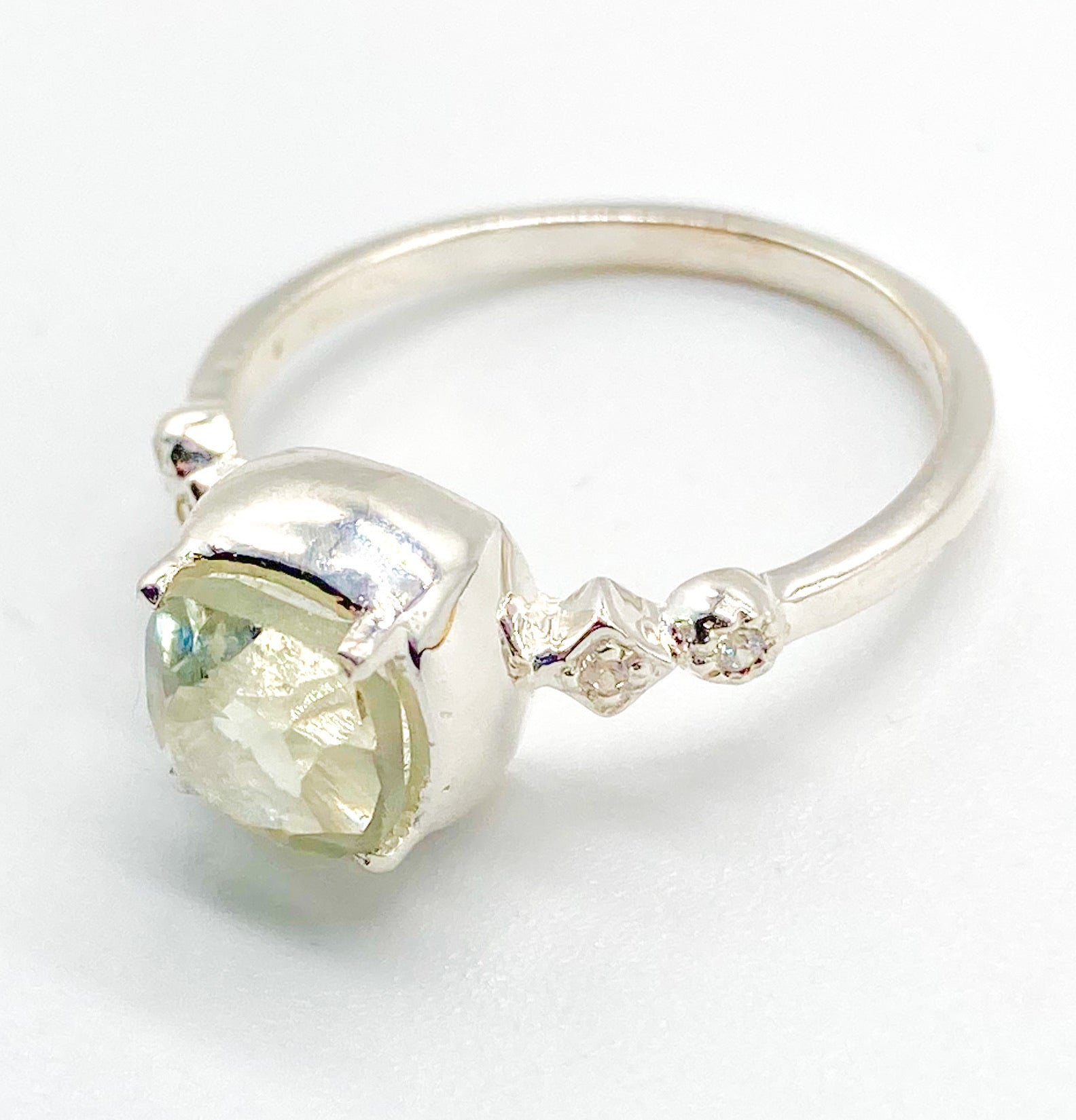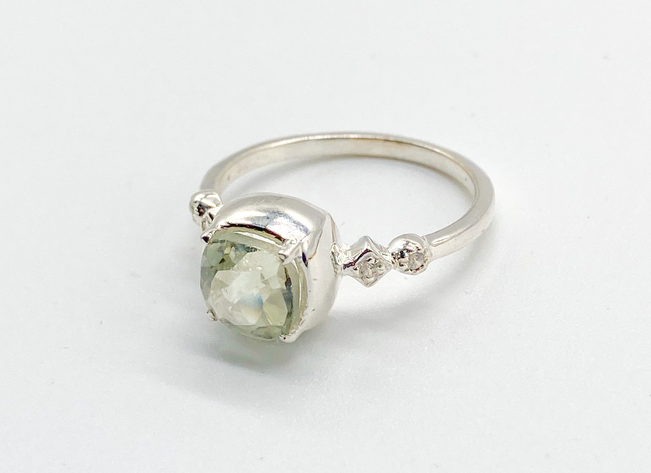 A 6mm cushion cut gemstone bezel set between 4 x 1mm zirconians. Sterling Silver.