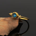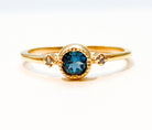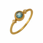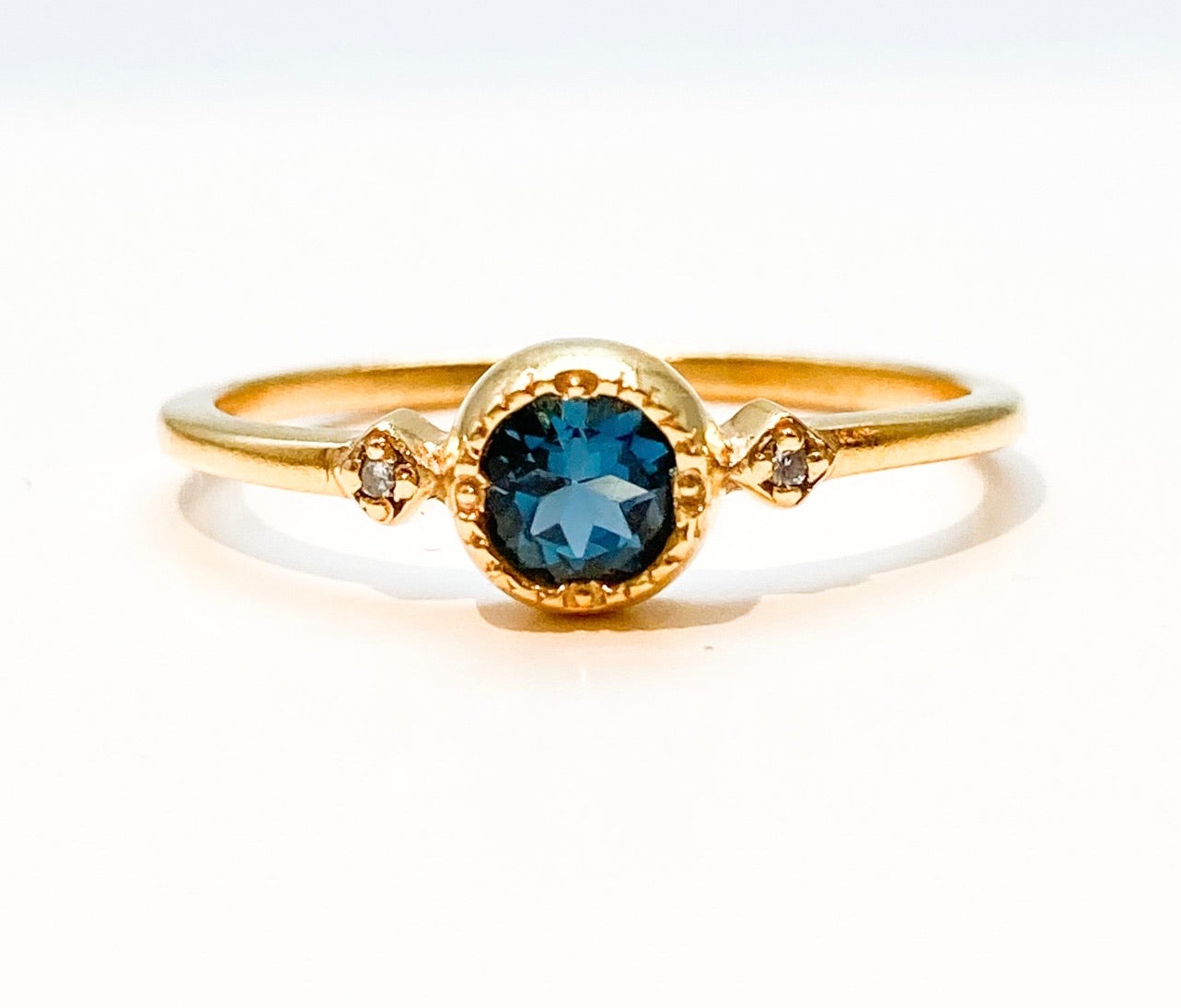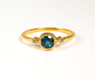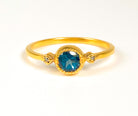 Inspired by timeless minimalism, rings that you put on and never take off. Designed to be elegant and delicate in design but sturdy in wearability. Round cut London Topaz center stone with 2 zirconian gems on each side. A minimal stacking ring oozing romance and style.