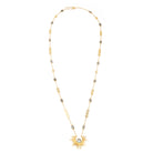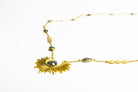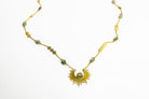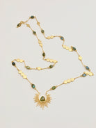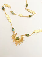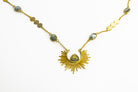A starburst pendant holds a Labradorite gemstone, while the gold chain has a series of gold coins and more beautiful Labradorite gems spread along the chain.