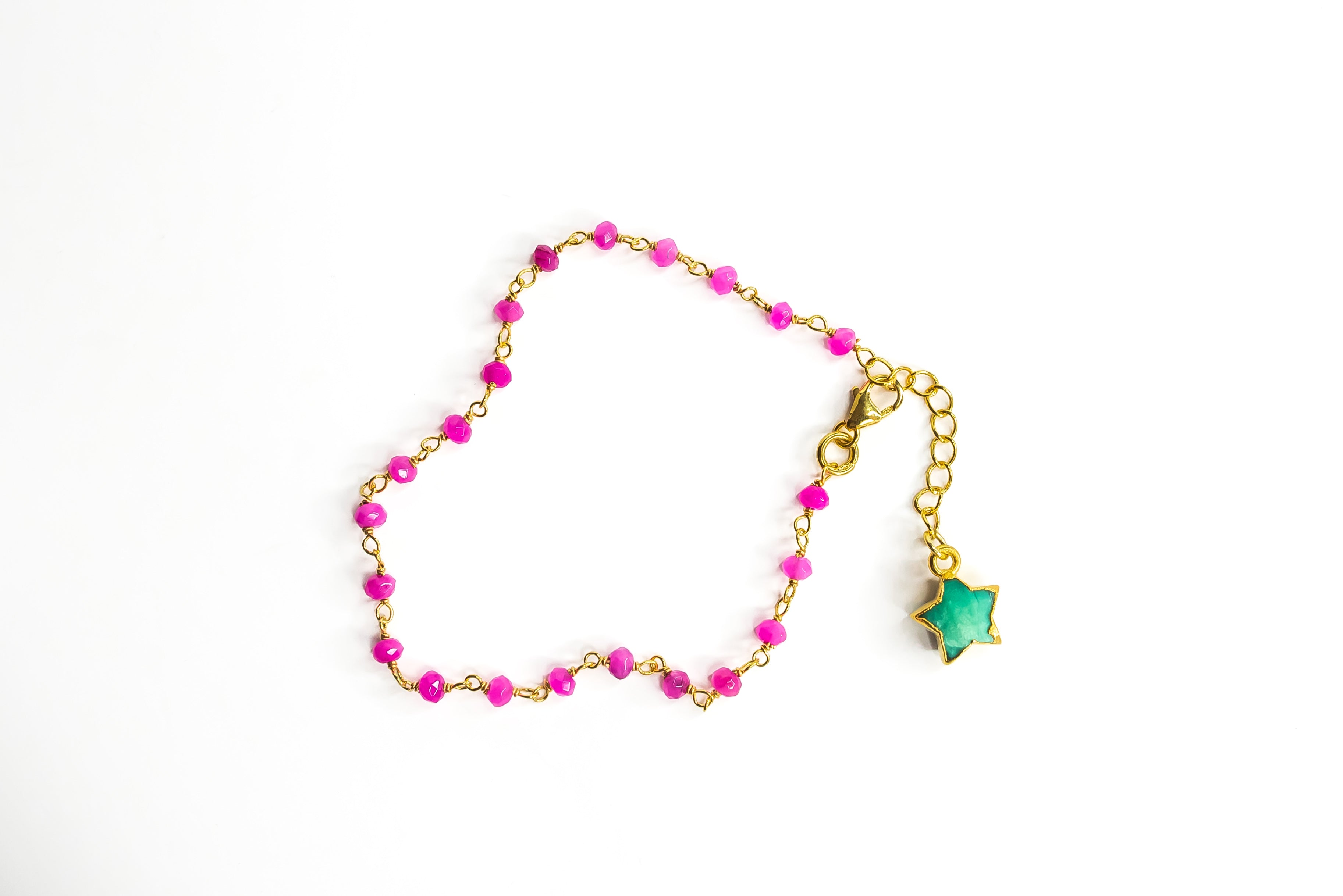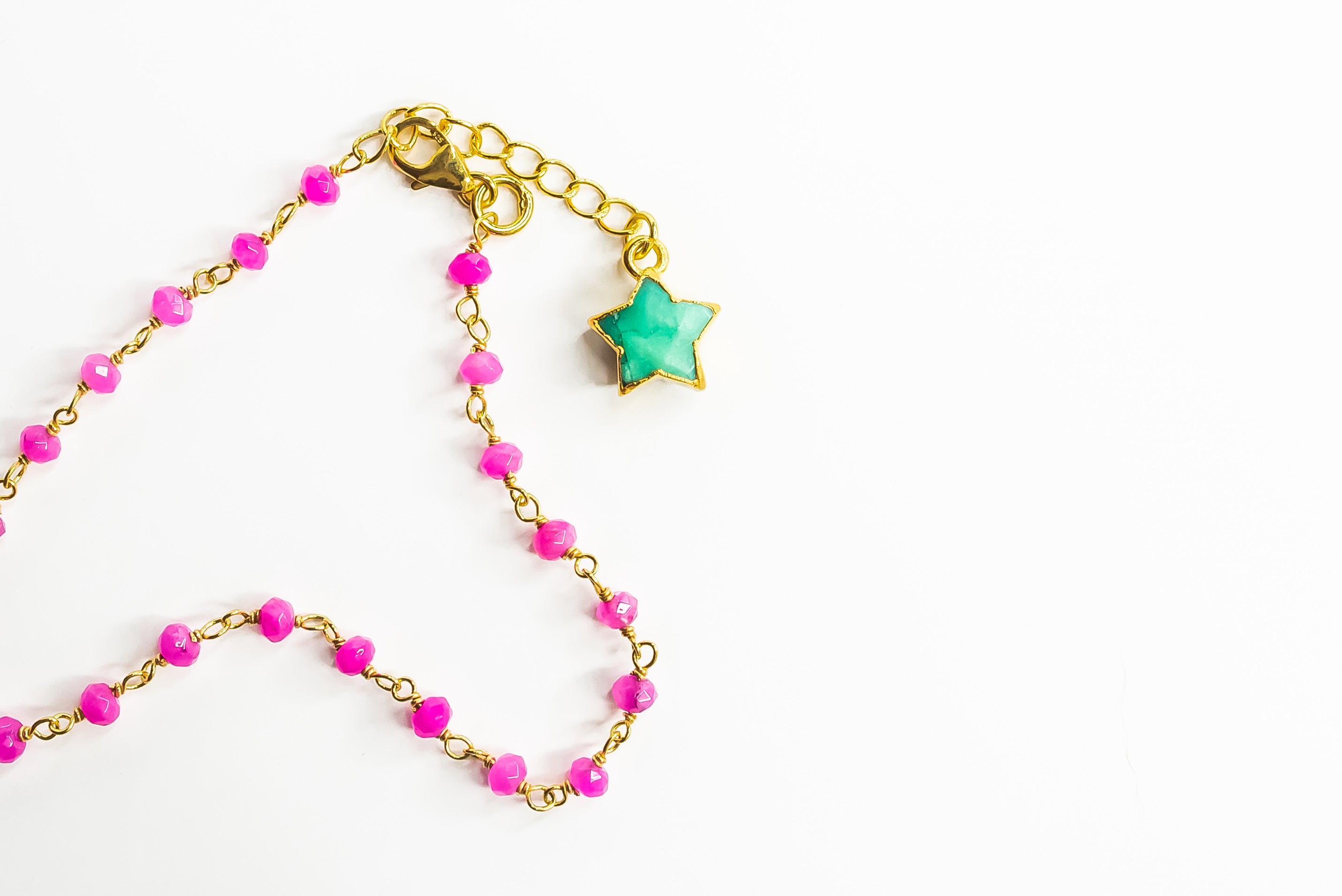 pink chalcedony stones with a Chrysophase heart stone to accent at the extension chain.