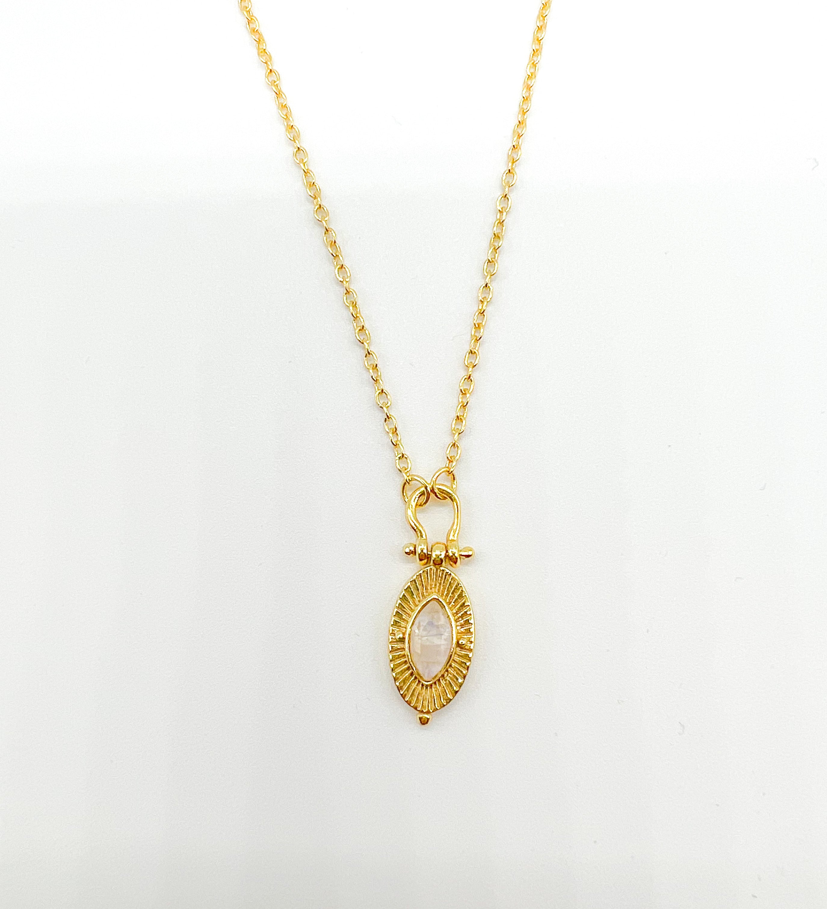 Gorgeous radiant moonstone bezel set with radiating lines to illuminate the stone. Hints of the ancient evil eye come through in this design.