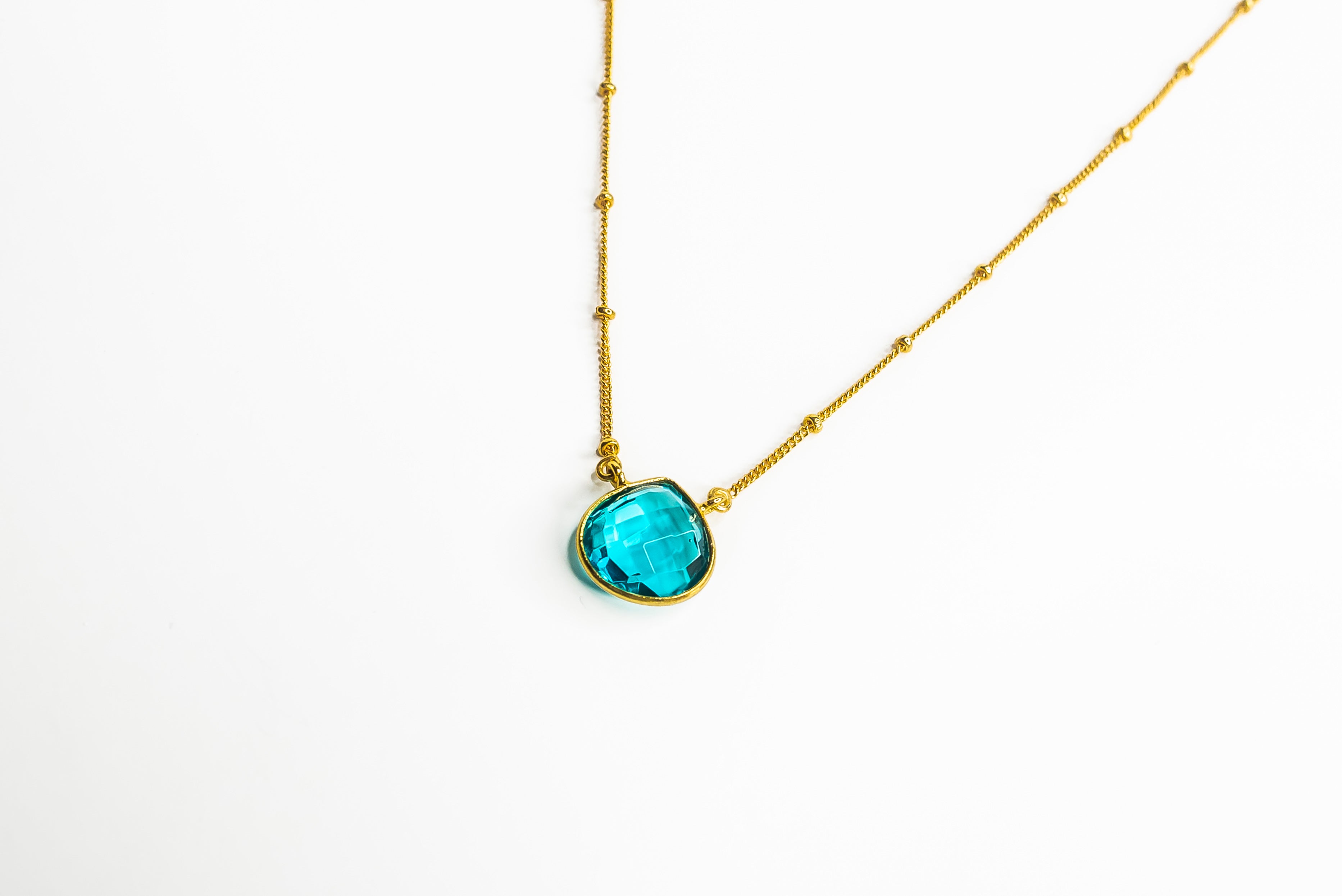 A brilliant tear drop cut London Topaz gemstone, set on a balled chain. The design is simply to let the gemstone shine against your skin, pulling through all your own essences.