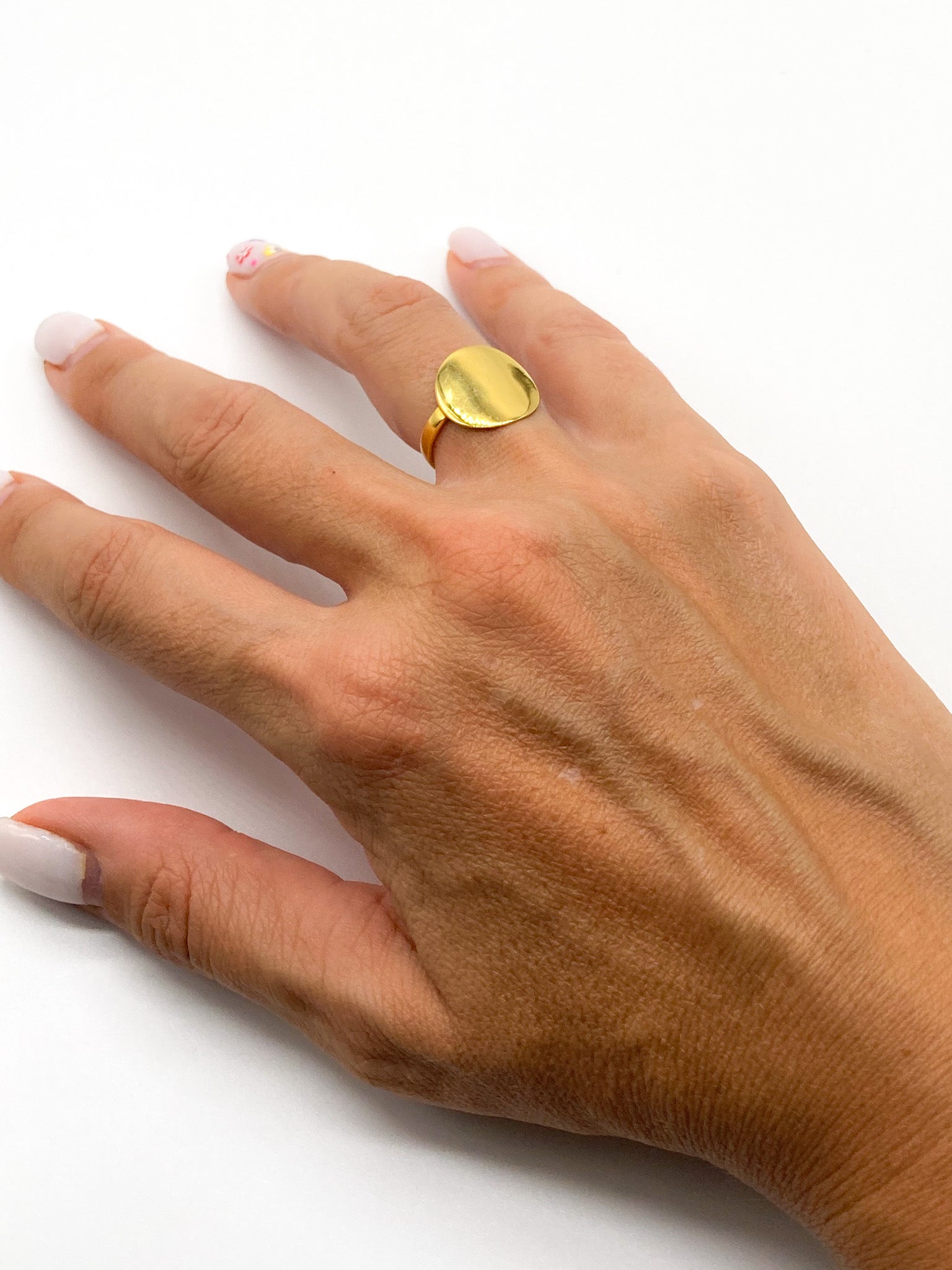 Gold round medallion ring center. 18k gold vermeil over sterling silver. A simple design that packs a punch of character, a must for all your layering ring collections, stack them up.