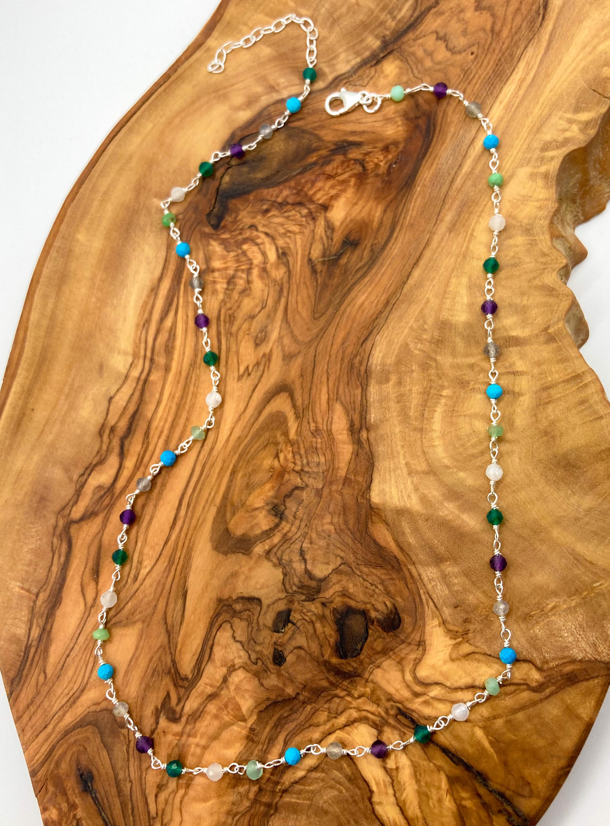 Mixed gemstones compliment each other in this infinity necklace. Designed to speak volumes on its own, or layer alongside other chains, the colors of this gorgeous piece will enhance any arrangement!