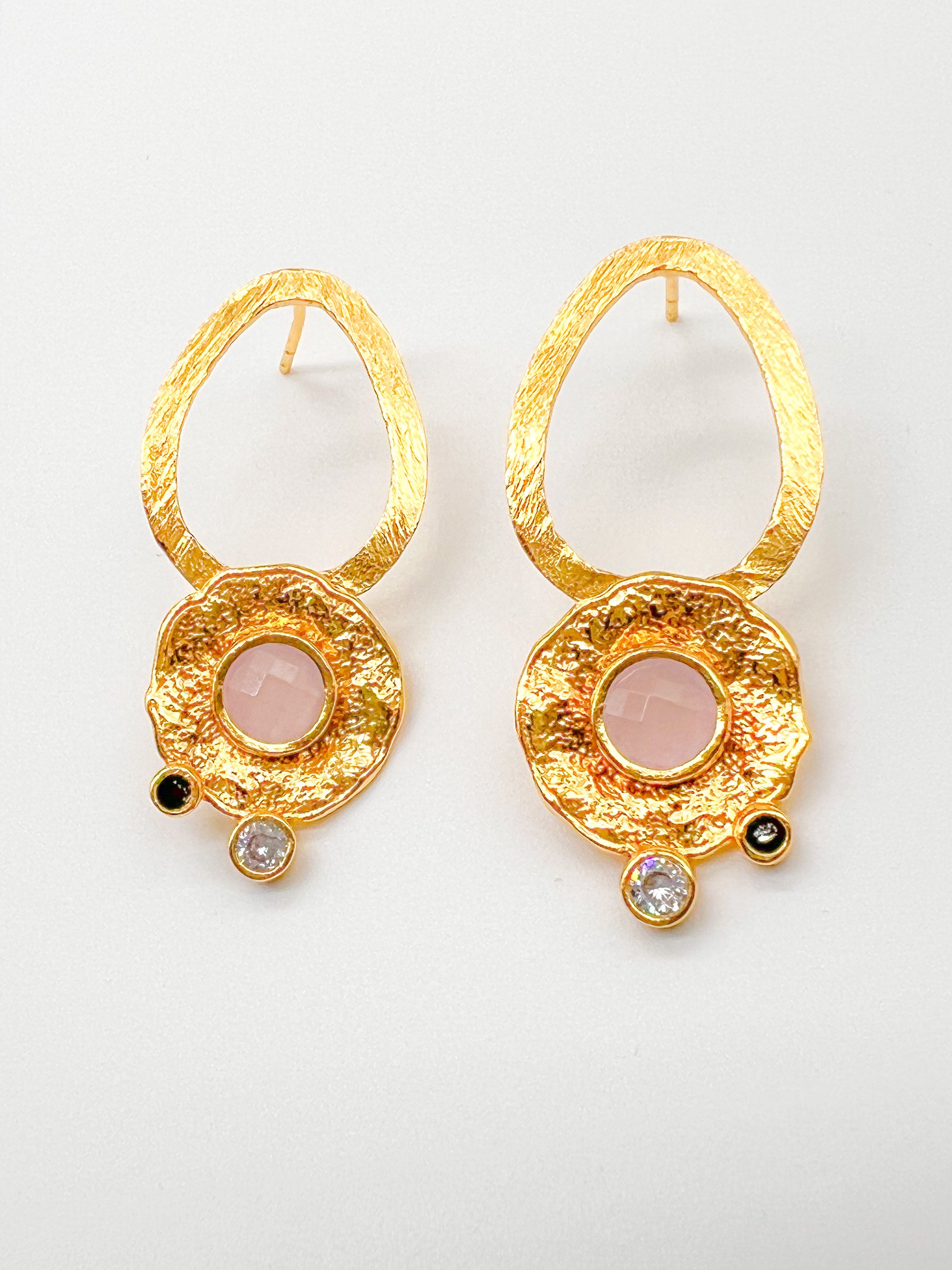 Gold Plated Pink Chalcedony & CZ, Black Onyx Gemstone Earring, Stone Size=6mm, 4mm, 2mm