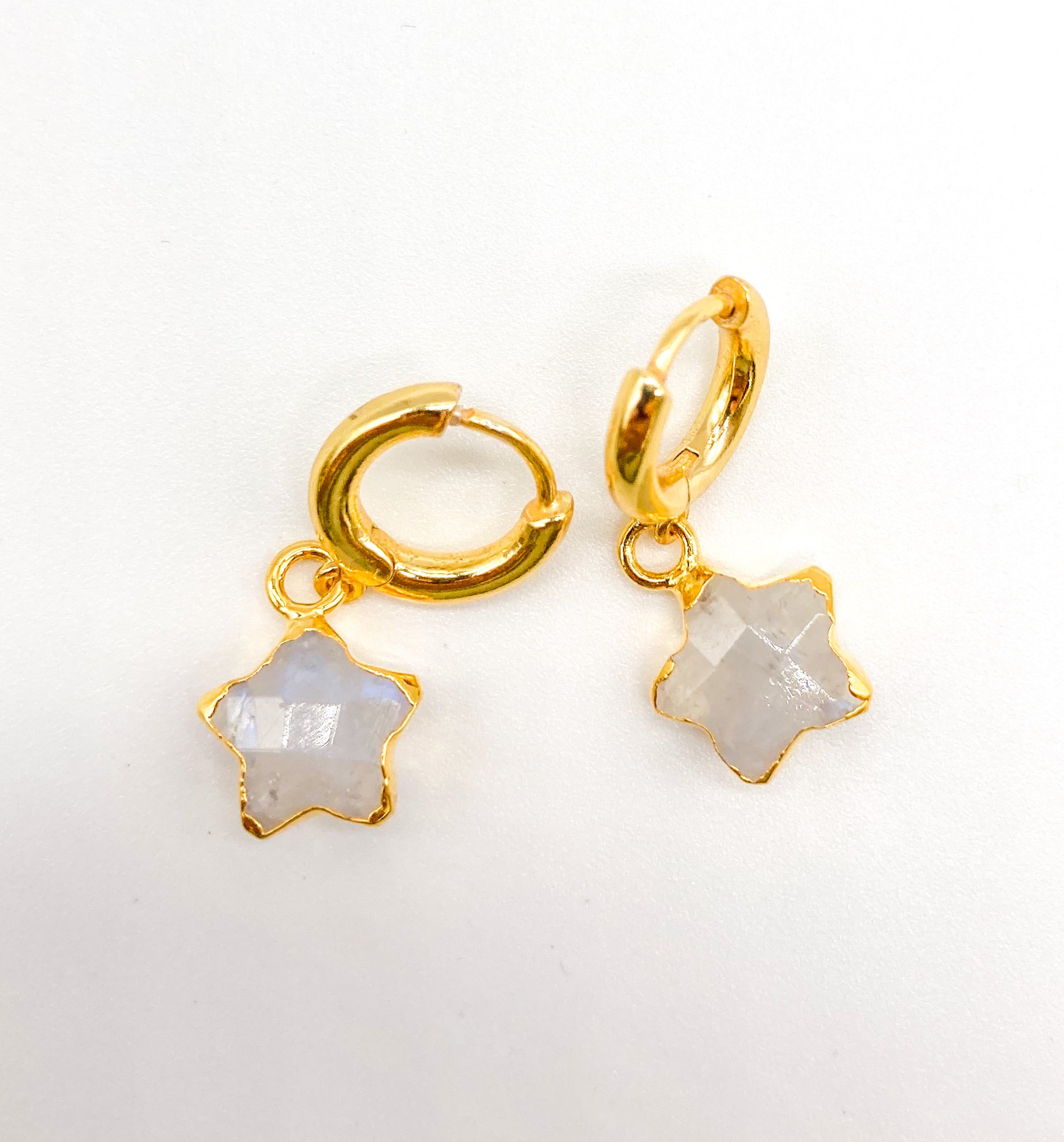 Star cut moonstone gemstones, wrapped in gold, hang from huggie earrings. Designed to bring a smile to your face and a skip in your step!
