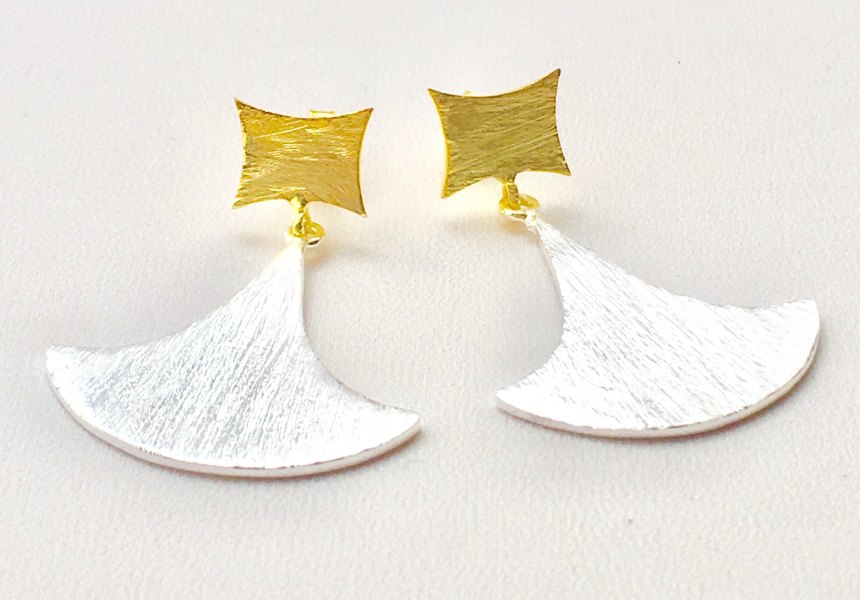 Inspired by the lines of a Viking ship, our Voyage earrings are unique in every way. Concave 18k Gold vermeil brushed studs suspend sterling silver pendants. Earrings that move gently with you, and light on your ear.